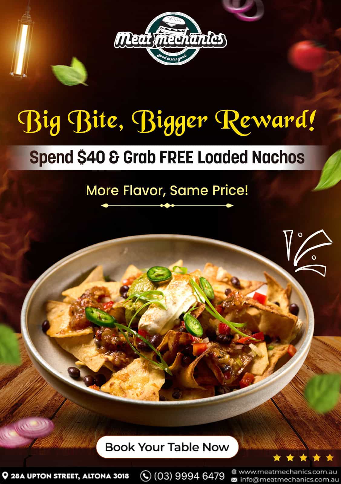 Delicious loaded nachos featuring seasoned meat, cheese, and fresh toppings from Meat Mechanics.
